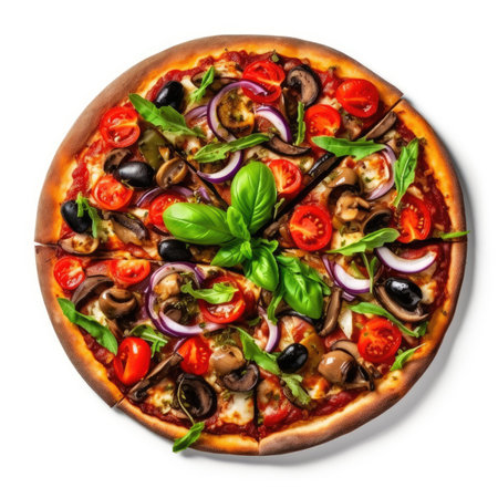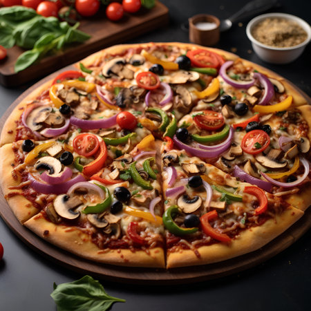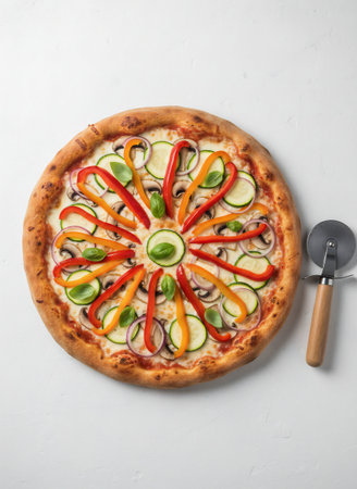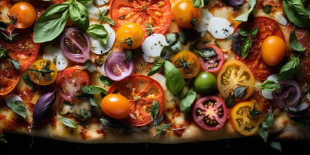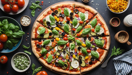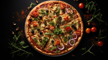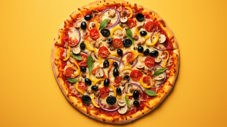 a vibrant and visually stunning pizza captured in high resolution. this unique creation features a colorful combination of olives, tomatoes, cheese, mushrooms, and onions. the birds-eye-view perspective showcases the pizza's realist lifelike accuracy, with its zigzag patterns and post-impressionist style. the yellow and maroon hues add an extra touch of visual appeal to this mouthwatering image. ai generated