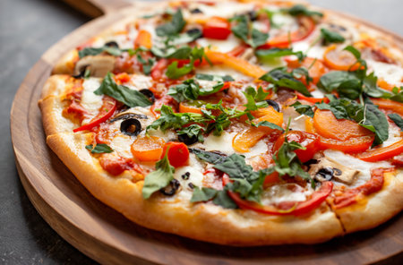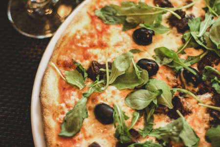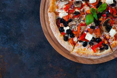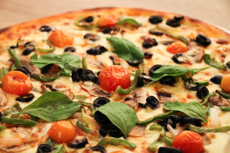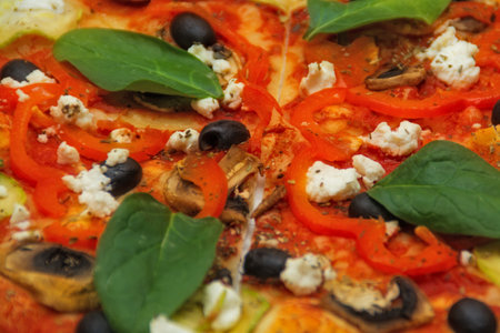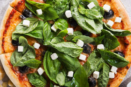 Traditional tasty pizza with mozzarella, feta, cherry tomatoes, spinach, mushrooms and kalamata olive, close up view, macro photography