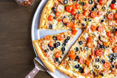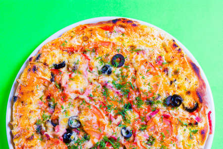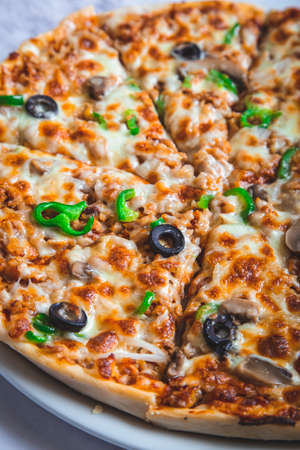 Close up Italian pizza with olives, tomatoes and cheese. Selective focus.