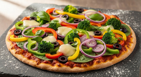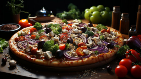 Healthy homemade vegetarian pizza on rustic wood table generated by artificial intelligence