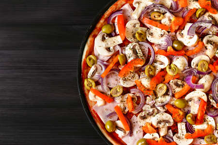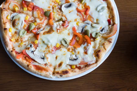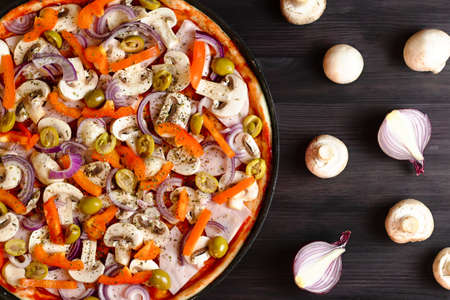Pizza with vegetables and mushrooms on wooden background. Top view.