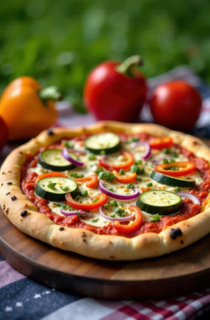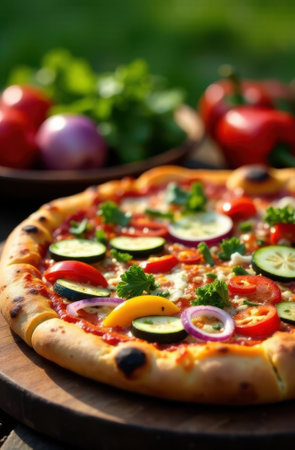 Freshly baked vegetarian pizza showcasing vibrant zucchini. Red bell peppers. Red onions. And mozzarella cheese. Resting on a wooden board with a blurred garden backdrop and tomatoes and bell peppers