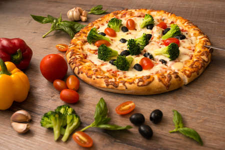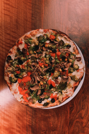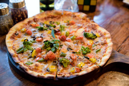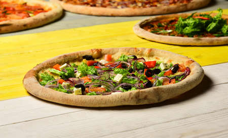 Close-up, vegetable vegetarian pizza on a wooden table, top view.