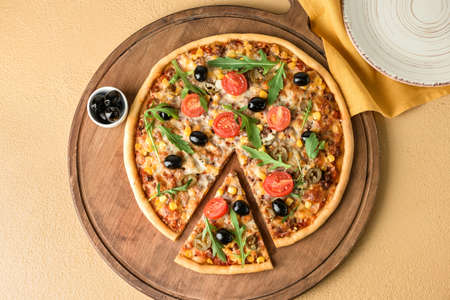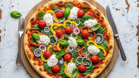 Pizza with fresh vegetables, including bell peppers, tomatoes, olives and arugula, on a wooden serving board