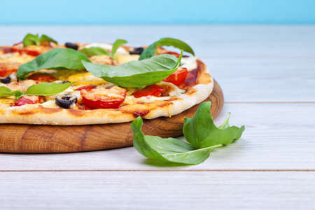 Close-Up Delicious Pizza on wooden cutting board top view. Mediterranean cheese snack, fast food, flour product. Fresh vegetarian nutrition. Italian pizza Margherita with Basil.