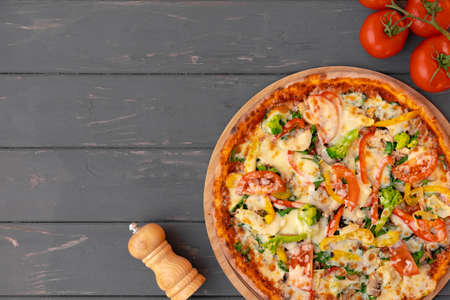 A top view of a delicious vegetable pizza on a wooden background with space for text