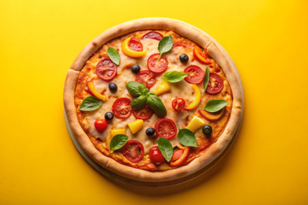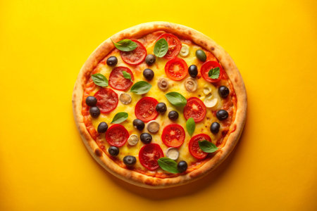 Vegetarian pizza with olives, broccoli, peppers and tomatoes on yellow background