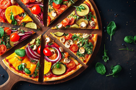vegetable vegetarian Pizza served at black table with free space. flat lay