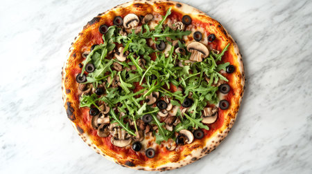 A vibrant top view of a gourmet pizza featuring an assortment of colorful toppings including olives, mushrooms, and arugula, arranged elegantly on a marble surface, ideal for food photography.