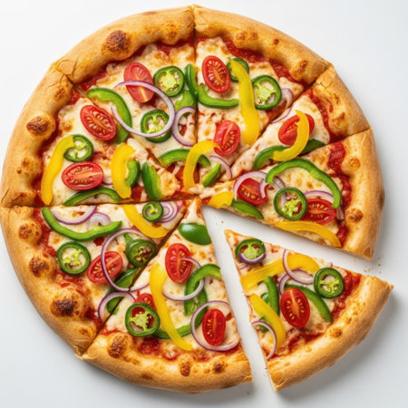Pizza with bell pepper, zucchini and mushrooms on white background