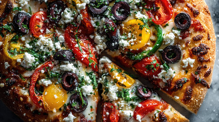 A vibrant vegetarian pizza featuring fresh herbs, olives, and colorful vegetables. Perfect for sharing at gatherings or enjoying as a tasty meal.