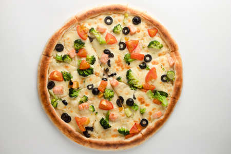 Pizza with olives, broccoli, tomatoes, red fish and cheese on a white background