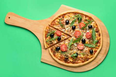 Vegan pizza with fresh garnet and arugula leaves on colored