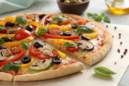 veggie pizza with vegetables on a wooden background - basil - olives - close up