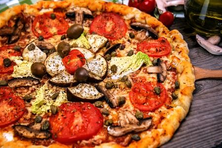 Vegetarian pizza with mozzarella cheese, olives and vegetables