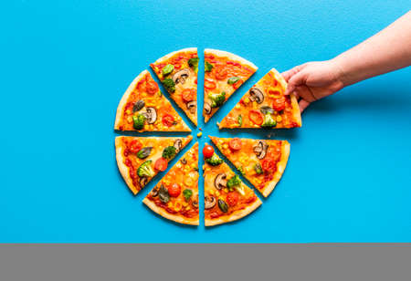 Above view with a woman's hand grabbing a slice of delicious homemade pizza. Vegetarian pizza with mozzarella, tomato sauce and plenty of fresh vegetables.