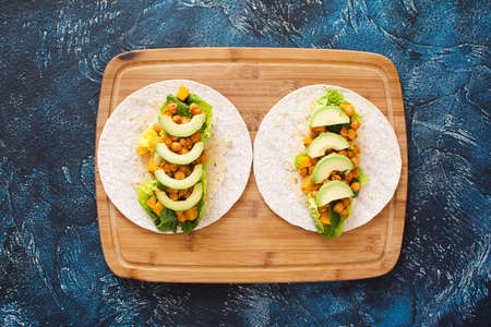 Preparation of vegetarian tortillas on the wooden board, chickpeas, butternut squash, spring onion, cucumber, avocado on the dark blue table, top view, copy space for text