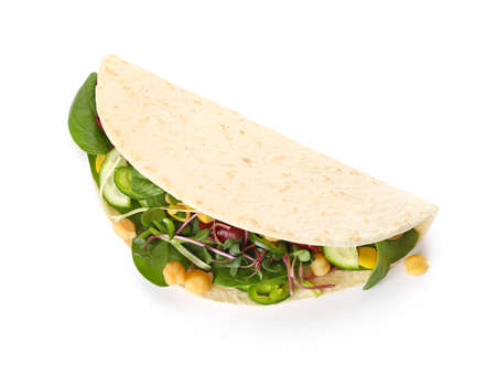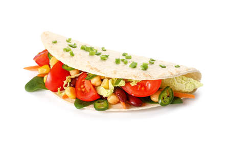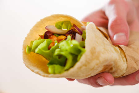 Mexican burrito with chicken, vegetables, pepper and beans. Burrithos takos food in hand. Street fast food on white background