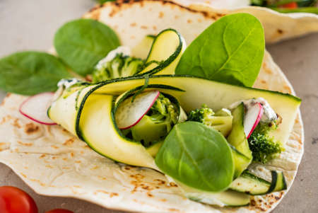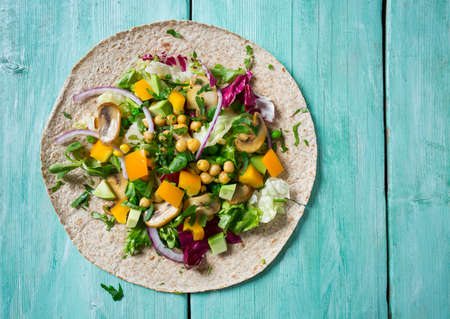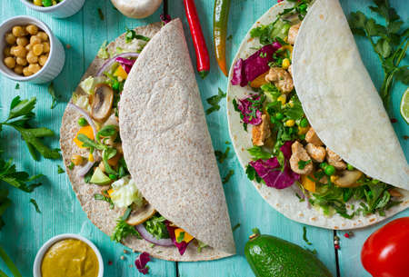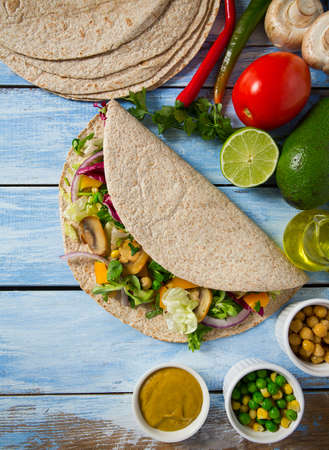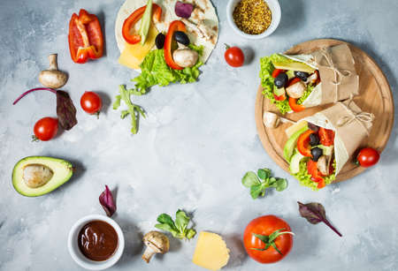 Healthy vegan lunch snack. Tortilla wraps with mushrooms, fresh vegetables and Ingredients on concrete background. Top view