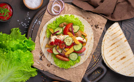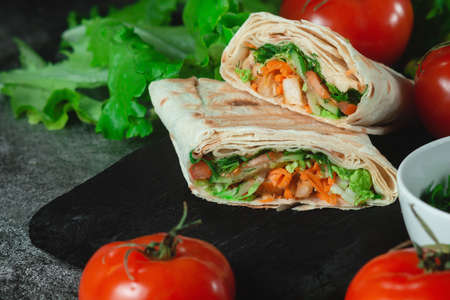Tortilla wraps, grilled Mexican chicken with vegetables, burritos, on a black table, without people,