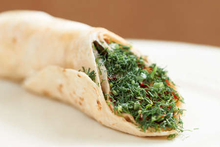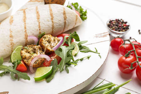 Homemade diet fresh shawarma with greens, chicken breast and tomatoes
