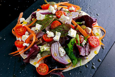Vegetarian tortillas taco wrap with red onion, sweet cherry tomatoes, carrots, ruby red chard, rocket and feta chees drizzled with olive oil.