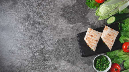 Wrap sandwich with grilled vegetables and meat on concrete background. Top view.