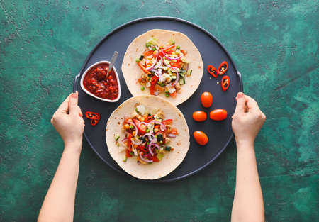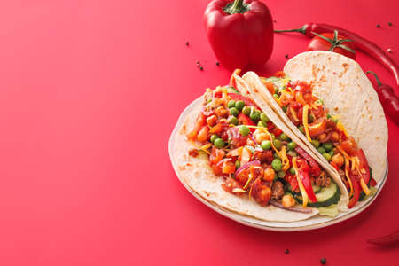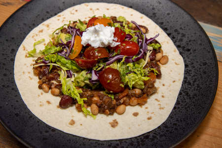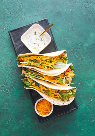 Preparation of tacos - delicious ingredients include tortilla and meat and vegetable stuffing