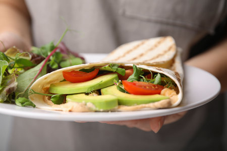 Woman holding plate with delicious hummus wraps and vegetables, closeup