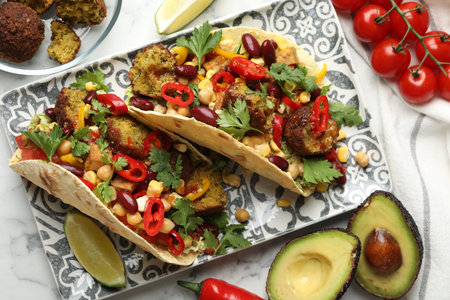 Tasty vegetarian tacos with falafel and other ingredients on white marble table, flat lay