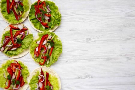 Top view corn tortillas with redish, cucumber, onion, parsley, pepper, and lettuce on white wooden table, from above. Copy space.