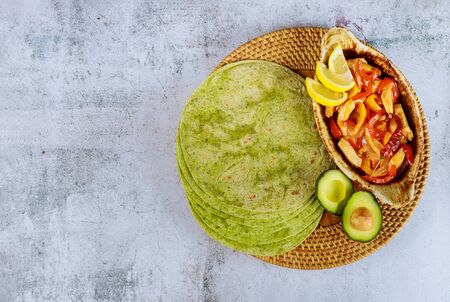 Spinach tortillas with fajita and avocado. Mexican cuisine.