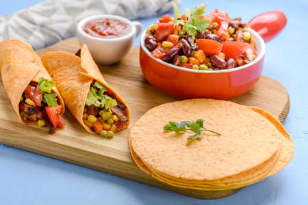 Tortilla wrap or burrito with corn, beans, greens, and homemade guacamole. Vegetarian healthy food, Mexican cuisine. copy space for recipe or text.