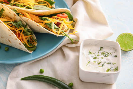 Healthy food snack. Tortillas taco with grilled chicken, avocado, fresh salsa, lettuce, lime. With yogurt & parsley sauce. On light gray stone marble table, wooden cutting board. Top view copy space
