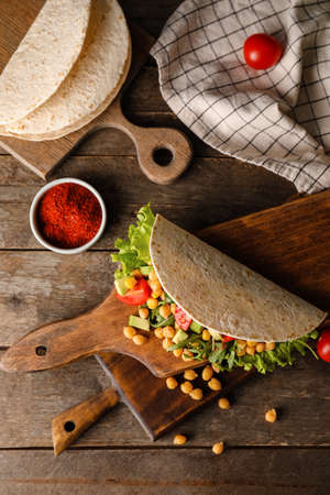Tortilla with vegetables and hummus with chickpeas. Front view.