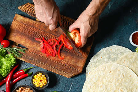 Preparing Mexican fajitas with cakes, tomato, pepper, spicy and meat.