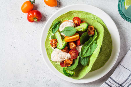 Open vegan green tortilla wrap with broccoli, tofu and tomatoes, top view. Vegetarian recipe, comfort food, plant-based concept.