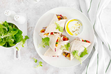 Grilled Mexican tortilla with vegetables on a concrete background. View from above.