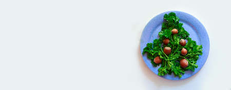 Christmas tree made of herbs and hazelnuts on a plate. New year decor from food. Isolated on a white background. Copy space