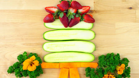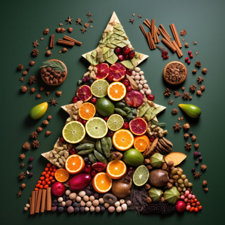 Unique Christmas tree crafted from a variety of colorful fruits and vegetables, bringing a fresh and healthy twist to traditional holiday decorations. Ideal for health-conscious holiday themes