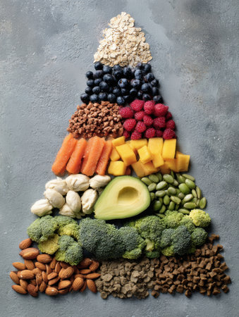 A diverse composition of nutritious food items elegantly presented in a balanced arrangement.