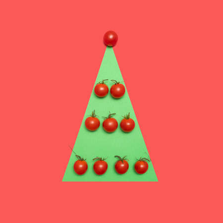 Festive Eco vegan concept. Green triangle with fresh organic italian cherry tomato. Flat lay arrangement.