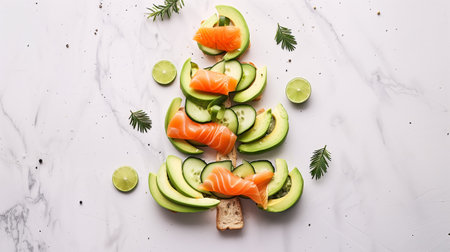 A Christmas sandwich with salmon, avocado, and lettuce on a white surface.