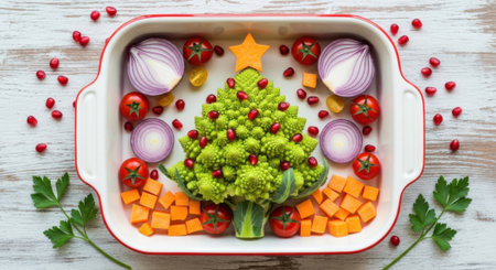 A vibrant Christmas tree shaped vegetable platter featuring romanesco broccoli, onions, tomatoes, carrots, and a star, perfect for a healthy and festive holiday appetizer.