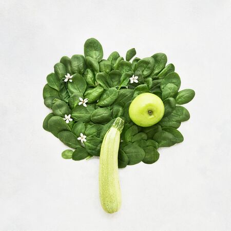 Abstract tree from green spinach leaves, zucchini and apple with tape measure. Healthy food, dietary and weight lose concept.Top view, copy space for text