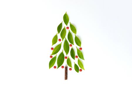 Flat lay Christmas tree with cherry on the white screen isolated from branch and leaves for nature and new year minimal concept
