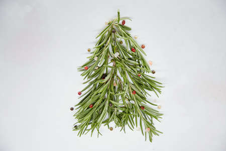 Festive creative Christmas tree made with rosemary and decorated with peppercorns and sea salt. Seasonal styling. Greenery background.Copy space. High quality photo