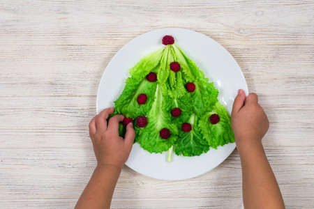 The Christmas tree is lined with green lettuce leaves, decorated with red raspberries on a white plate. The child is about to eat a Christmas tree salad. Food for the New Year. Table decoration.