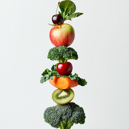 Colorful fresh fruit and vegetable tower with cherry, apple, kiwi, broccoli.