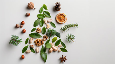 A creative arrangement of natural elements forms a Christmas tree shape, featuring nuts, leaves, and dried fruits on a white background, evoking a festive spirit.